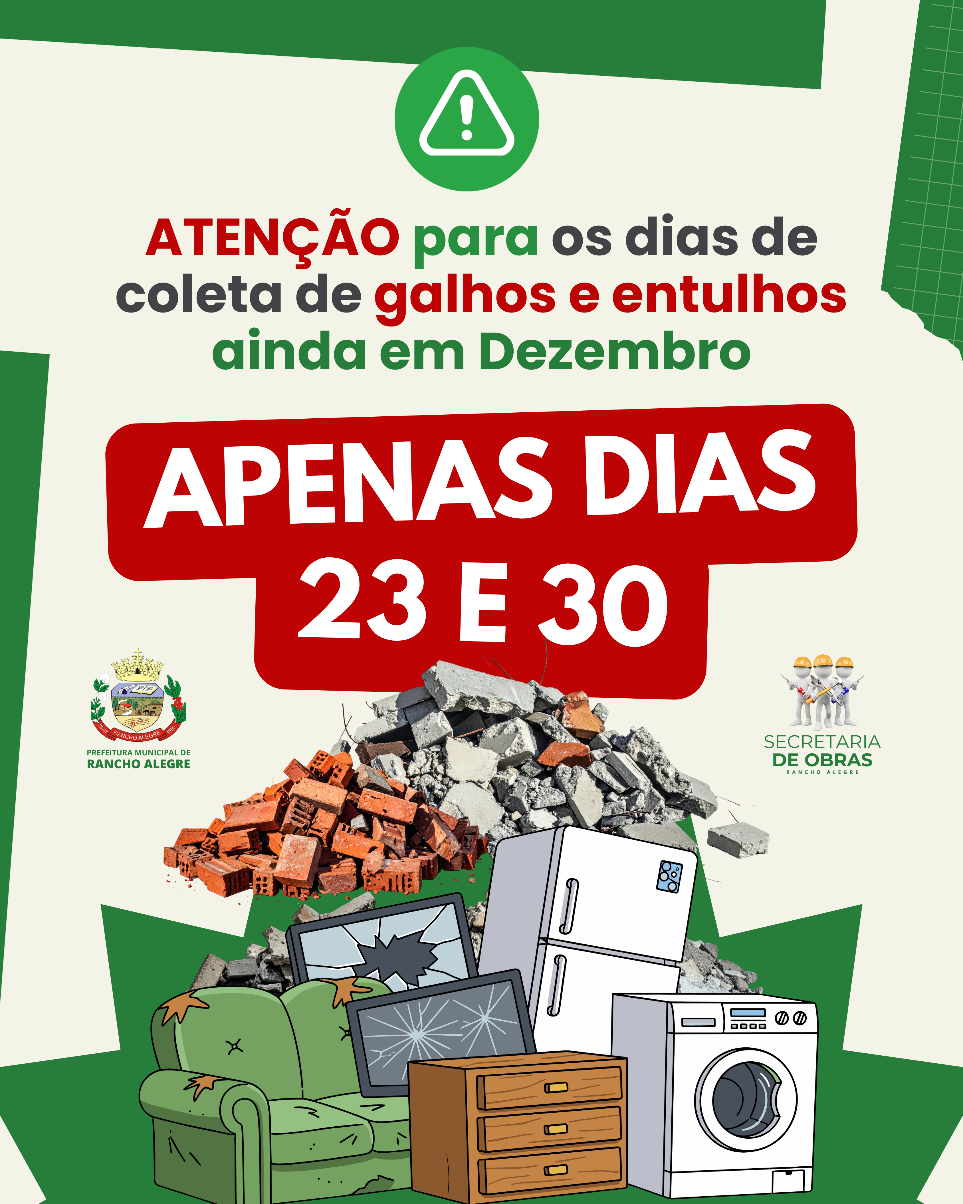 A Prefeitura de Rancho Alegre, por meio da Secretaria Municipal de Obras, informa à população sobre dois importantes serviços urbanos: a coleta de galhos e entulhos, que ocorre ainda em dezembro, e o cronograma de podas de...