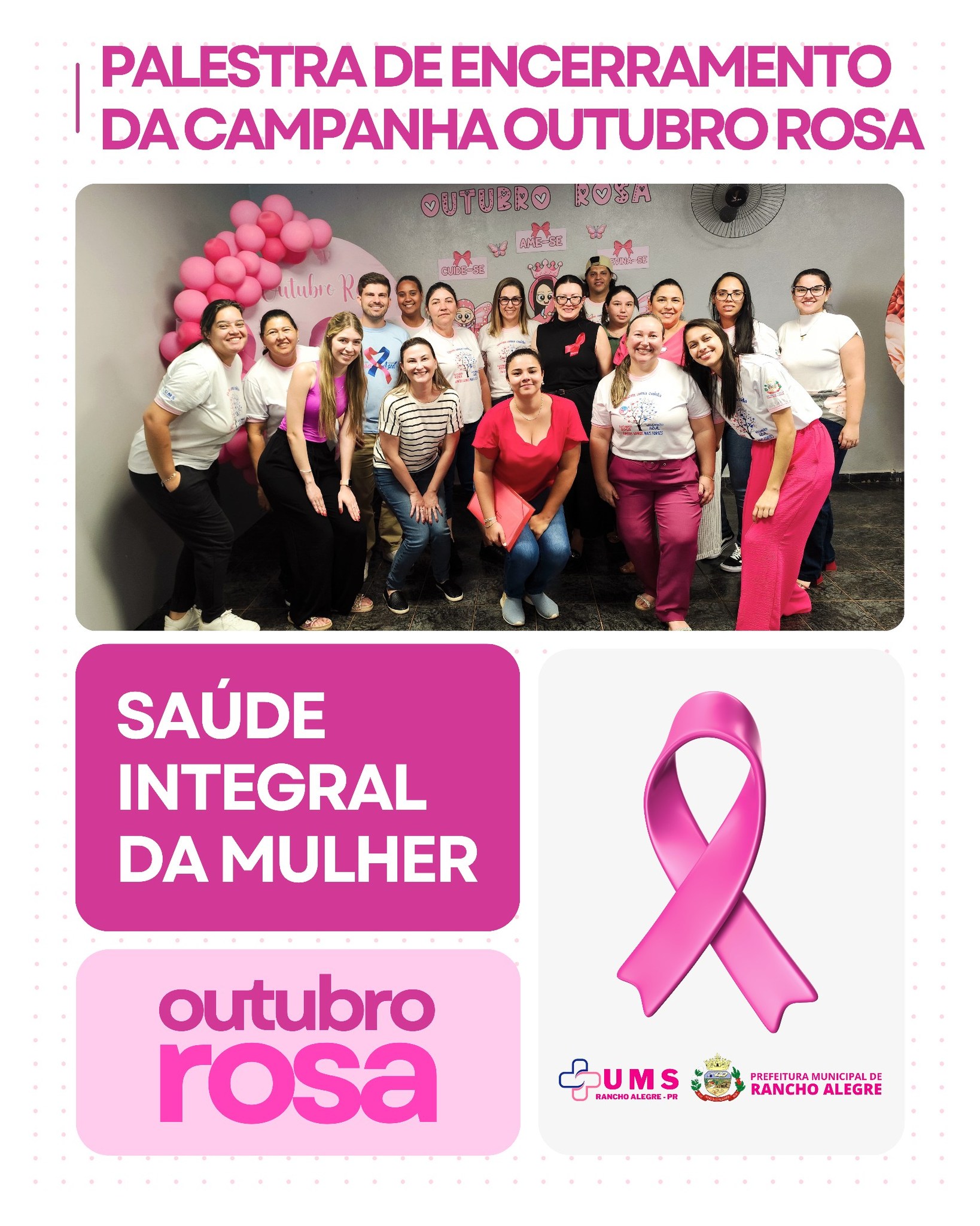 A Secretaria Municipal de Saúde de Rancho Alegre encerrou, no dia 30 de outubro, a campanha Outubro Rosa, mês dedicado à prevenção do câncer de mama e do câncer do colo do útero, com a realização de uma palestra especial ministrada pela médica da família, Dra. Poliana.